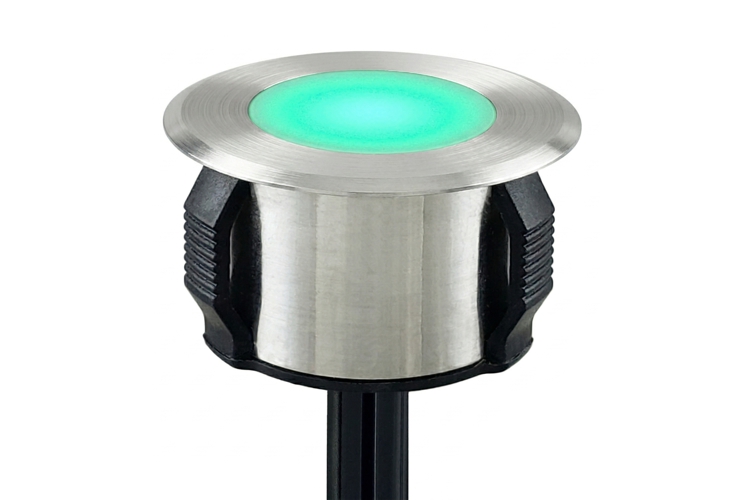 The PL100LED RGBW is machined from a one piece of solid 316 Stainless Steel and has a 1-3/8" diameter bezel, with a 3/4" diameter internally frosted tempered acrylic lens. The PL100LED installs easily into any 1-1/8" diameter core drilled hole.
